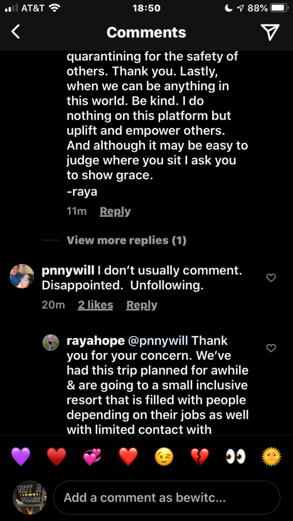 OK I posted this to my page but did not necessarily fully explain it. The above pictures are of an Instagram influencer who I quickly unfollowed after only following a few days. I was very shocked that she would be so ignorant as to travel and take her family to another country where we know there are coronavirus/Covid19 infections. Me myself, would I travel at this point no I wouldnβt even though I want to remove myself from this current position Iβm in. Traveling is not advised by the government by the local or federal. I saw a clip on Twitter about socialism and capitalism and if Bernie Sanders gets elected that this could be A permanent situation and I remember tweeting that what would happen if Joe Biden got elected would it be the same as βstatus quo under the coronavirus situation. Anyway I donβt give two shits whether this influencer gets mad because she had over 120 comments that were from followers or former followers that are very upset with her decisions. οΏΌοΏΌοΏΌοΏΌοΏΌοΏΌ